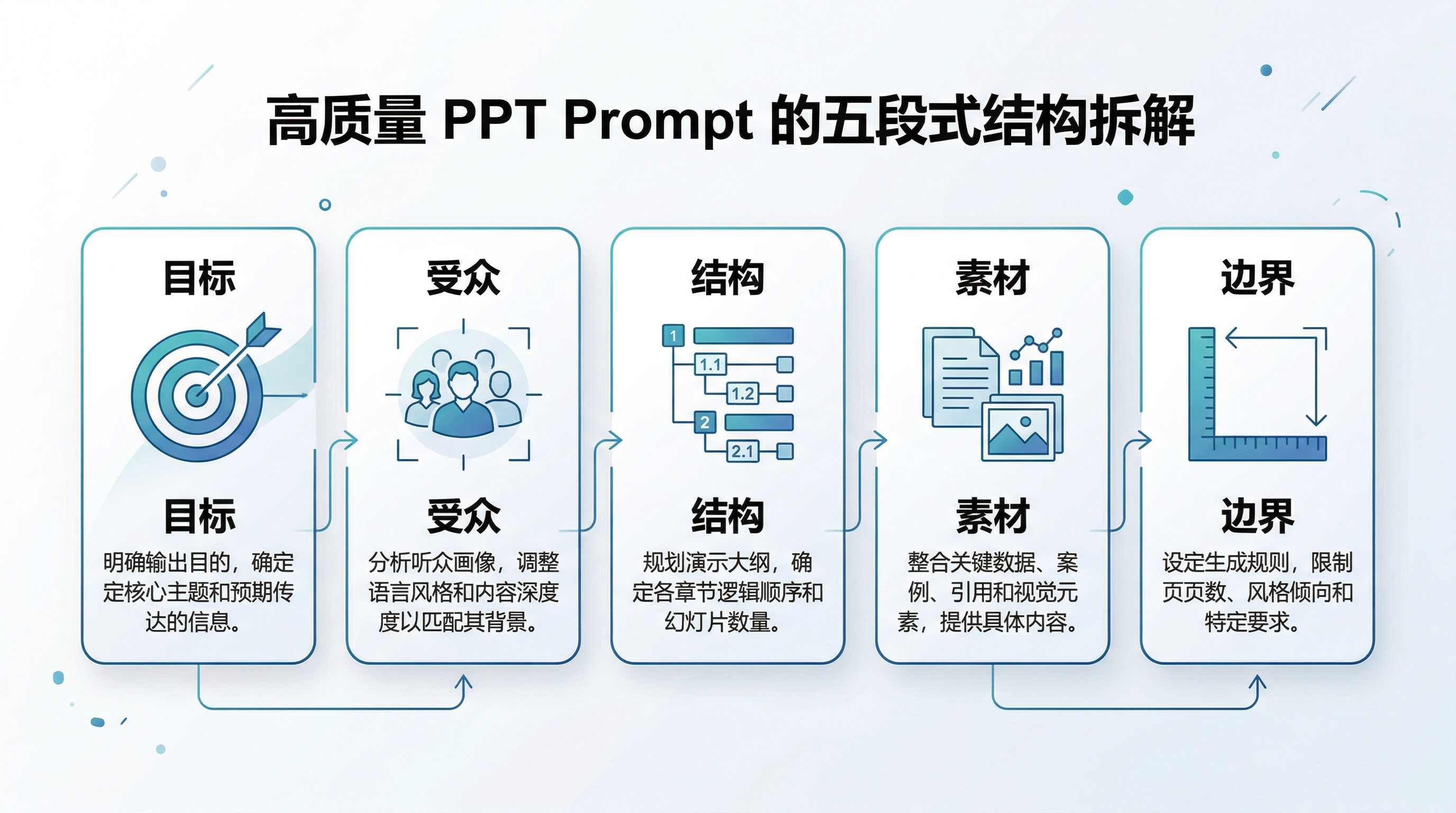 从目标定义、受众约束到内容结构、视觉要求和迭代方式,系统讲清楚如何写出一次成稿率更高的 PPT Prompt,并附可直接复用的模板。